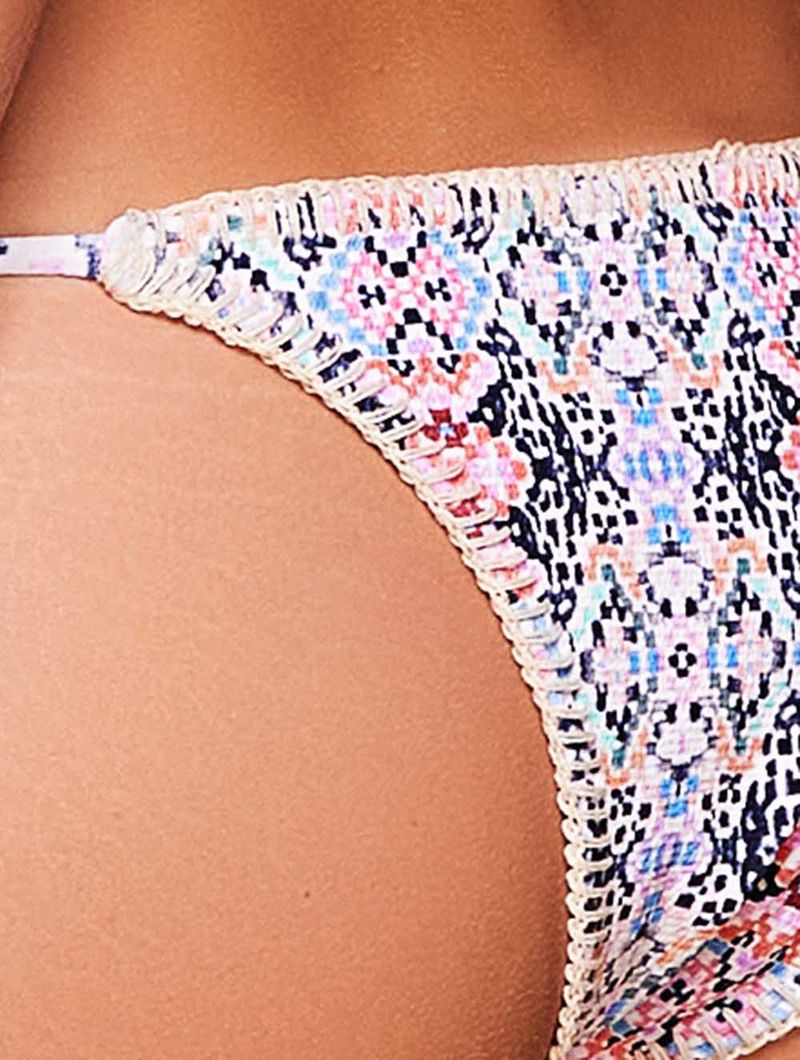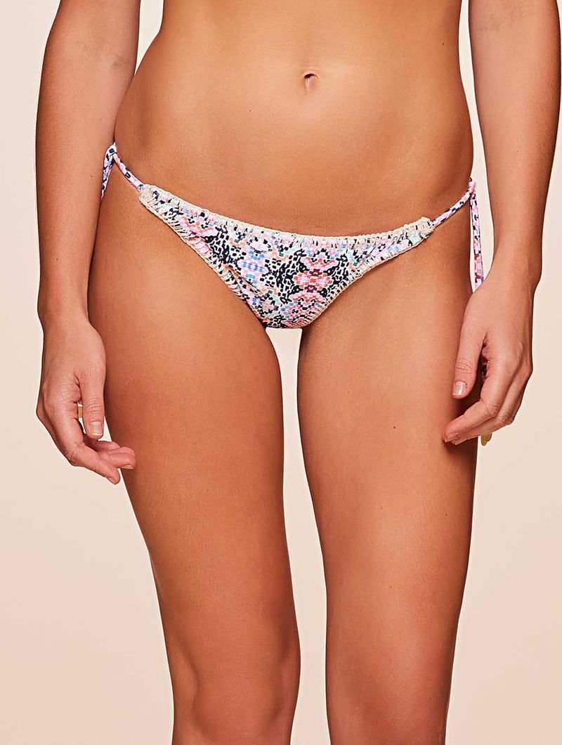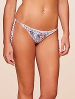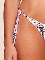 Tanga amarradinha estampada. O modelo possui possui laterais finas ajustáveis com ponteiras madrepérola, acabamento limpo e cobertura pequena.