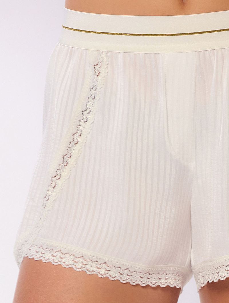 Short doll confeccionado em tecido maquinetado com elegantes detalhes listrados. A regata, possui alças finas e ajustáveis, é realçada por uma delicada aplicação em renda no decote e uma fita de amarração feita no próprio tecido. Short possui cós em elástico adornado com detalhe dourado, braguilha falsa no gancho e aplicação de renda nas laterais e na barra.