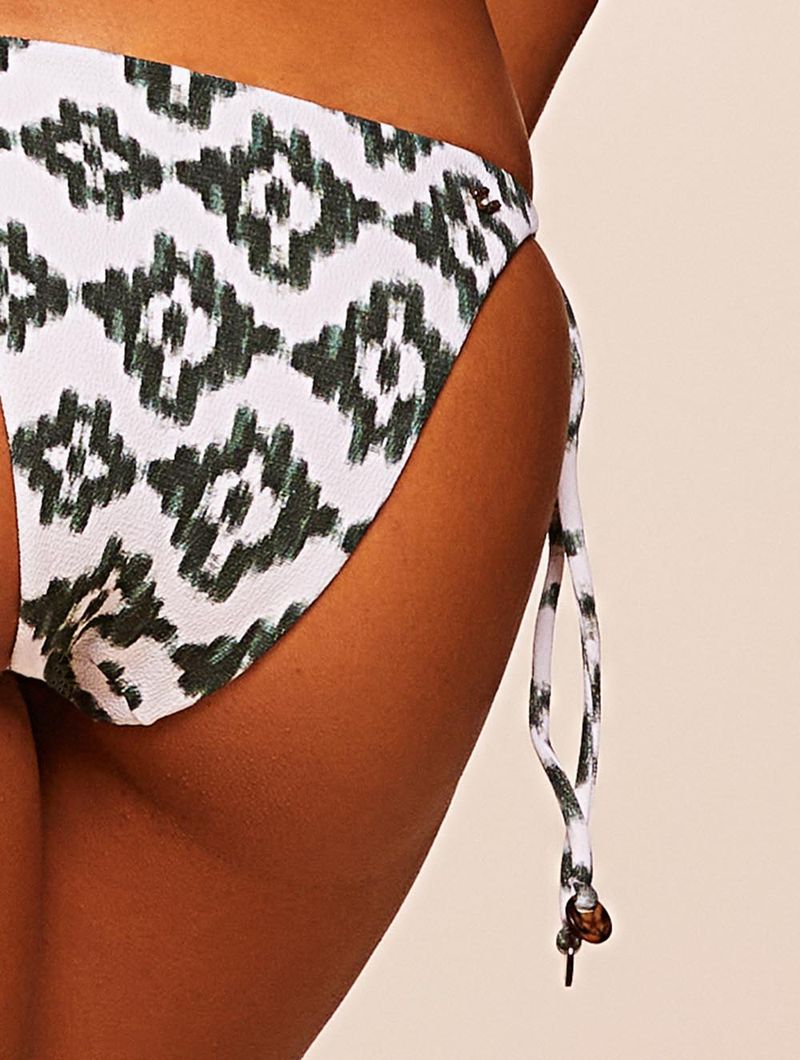 Tanga amarradinha estampada. O modelo possui laterais finas ajustáveis, ponteiras com acabamento em tartaruga e pequena cobertura.
