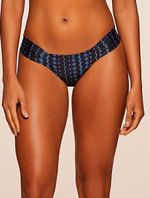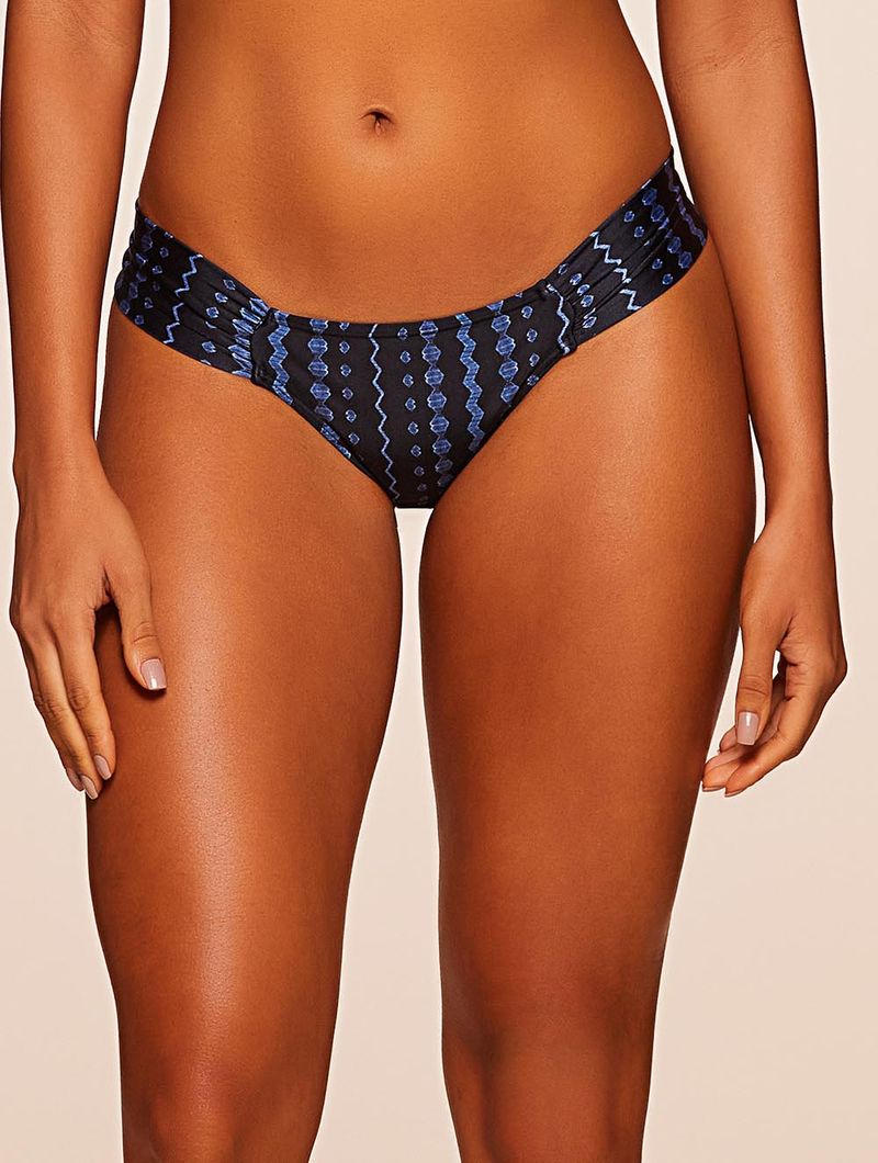 Tanga lateral média estampada. Modelo com recortes laterais franzidos por meio de tecidos duplos drapeados. Detalhe de metal no banho de Ouro Velho nas costas.