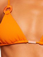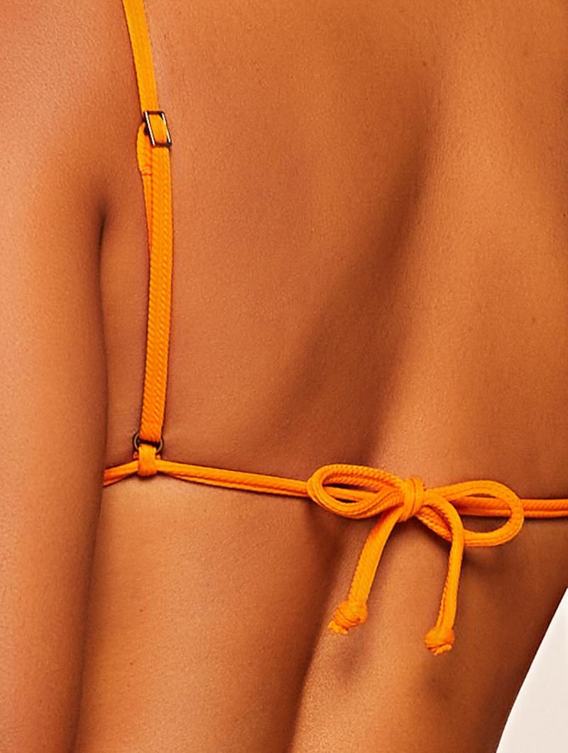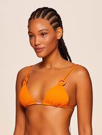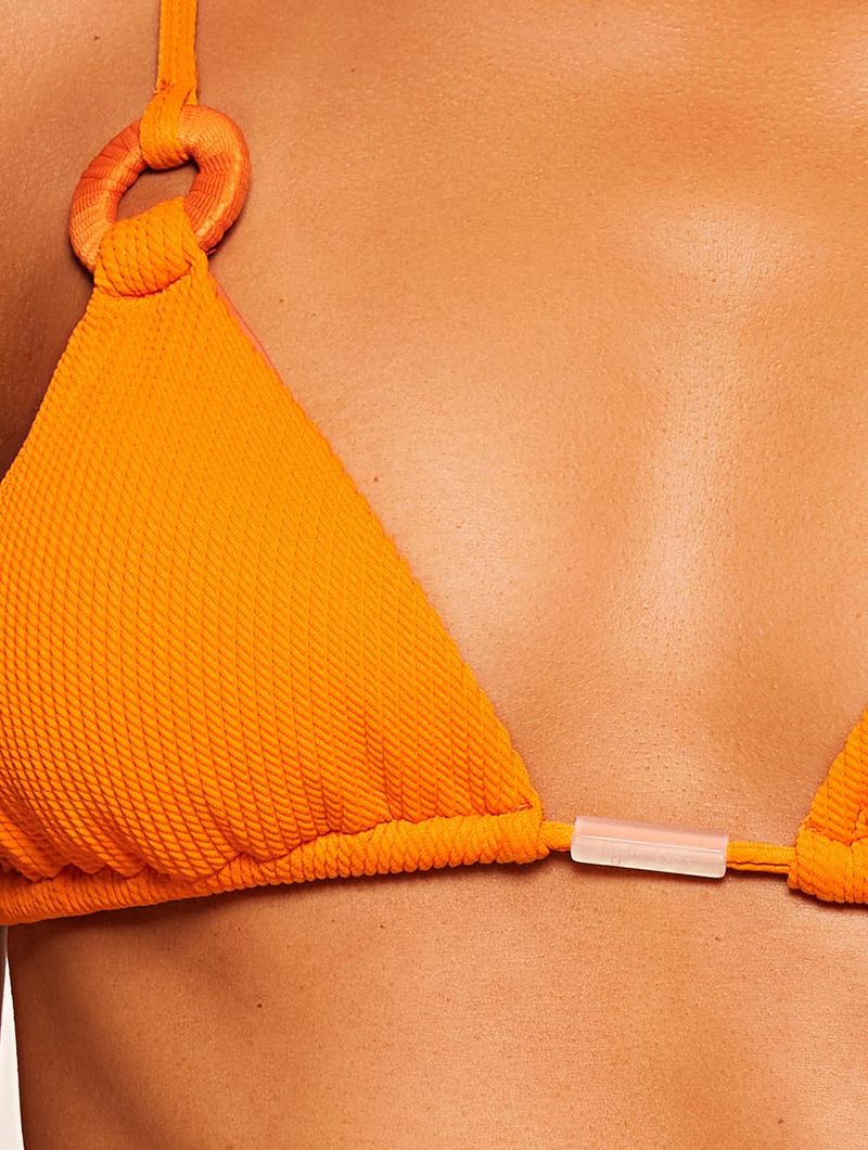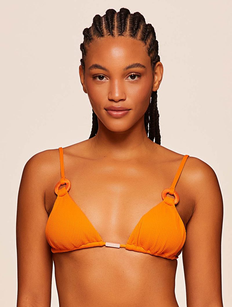 Top cortininha liso. O modelo possui bojo removível, alças fixas com regulagem, detalhe de argolas encapadas e amarração nas costas.