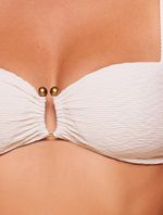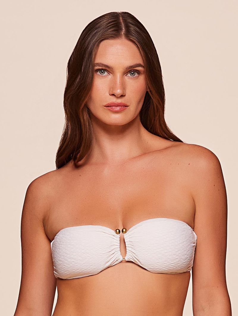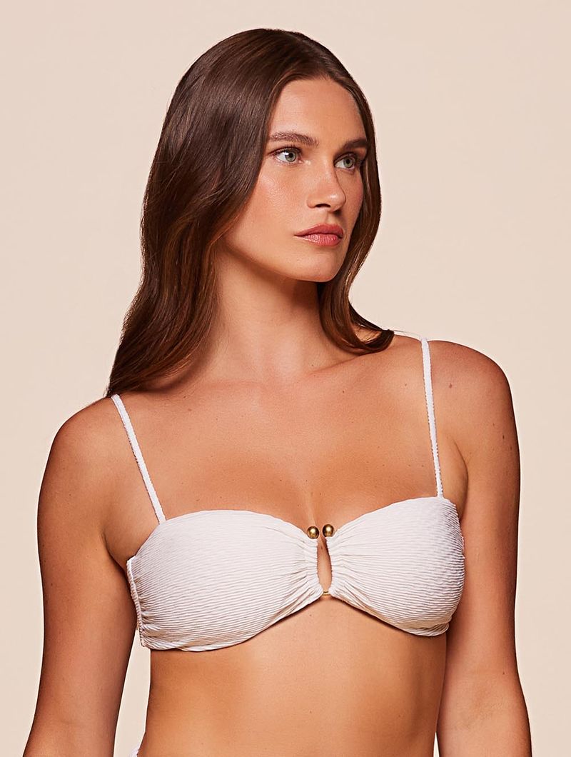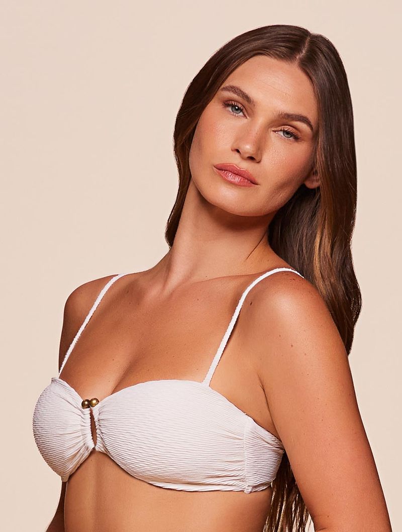 Top faixa liso. O modelo possui bojo fixo, com alças removíveis, entremeio de metal e fecho de ímã nas costas no banho de Ouro Velho.