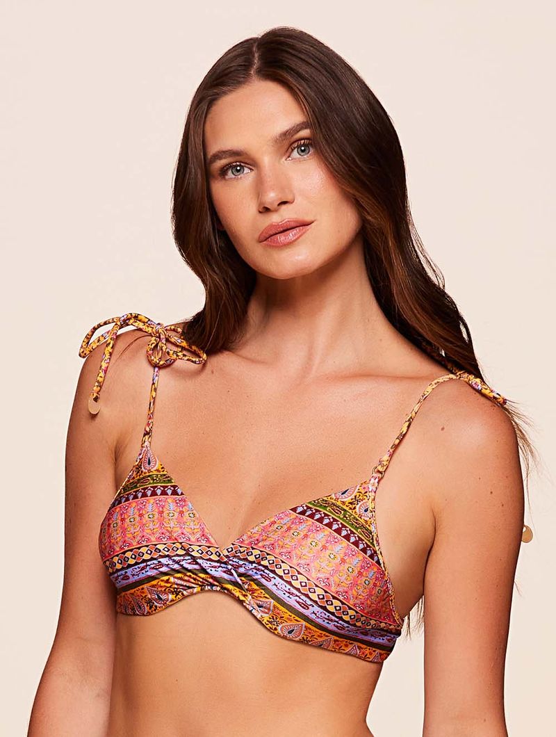 Top meia taça estampado. O modelo possui bojo removível, com decote transpassado, amarração nas costas, e nos ombros com ponteiras em madrepérola. Peça com aro para maior sustentação.